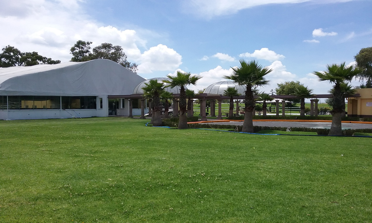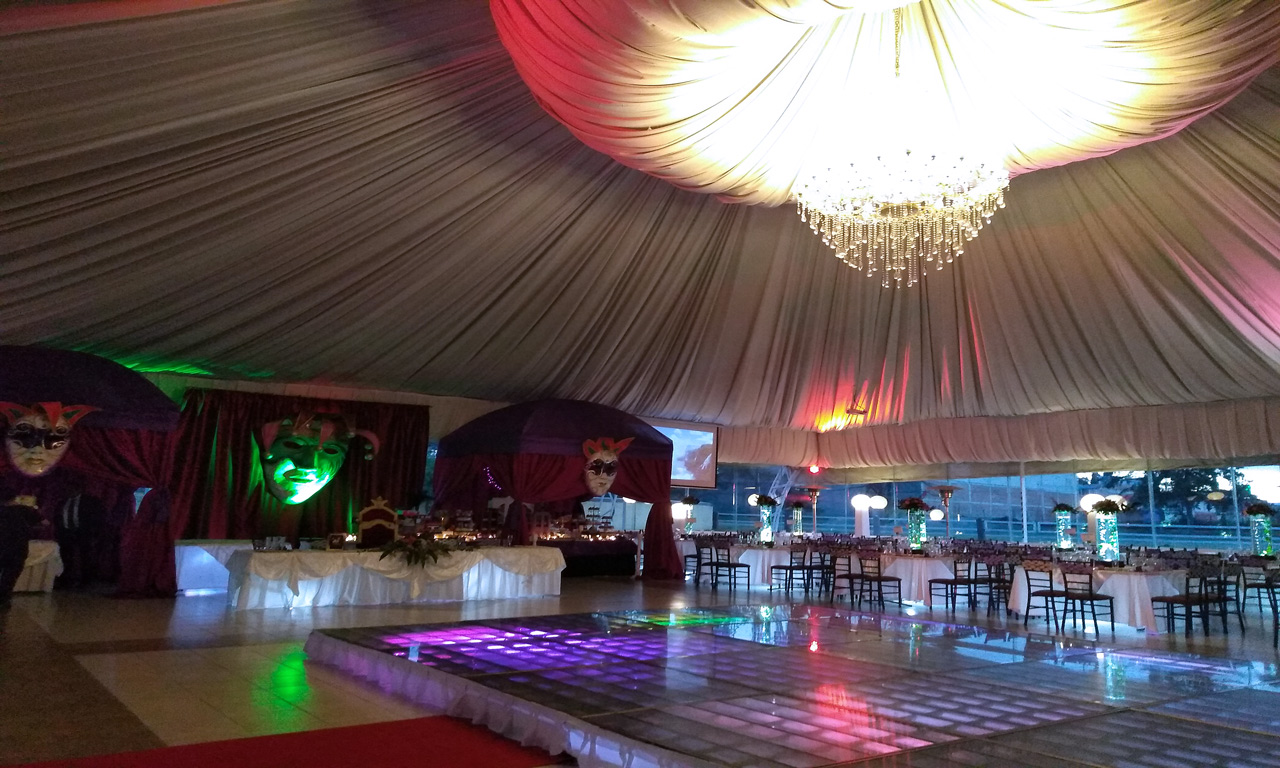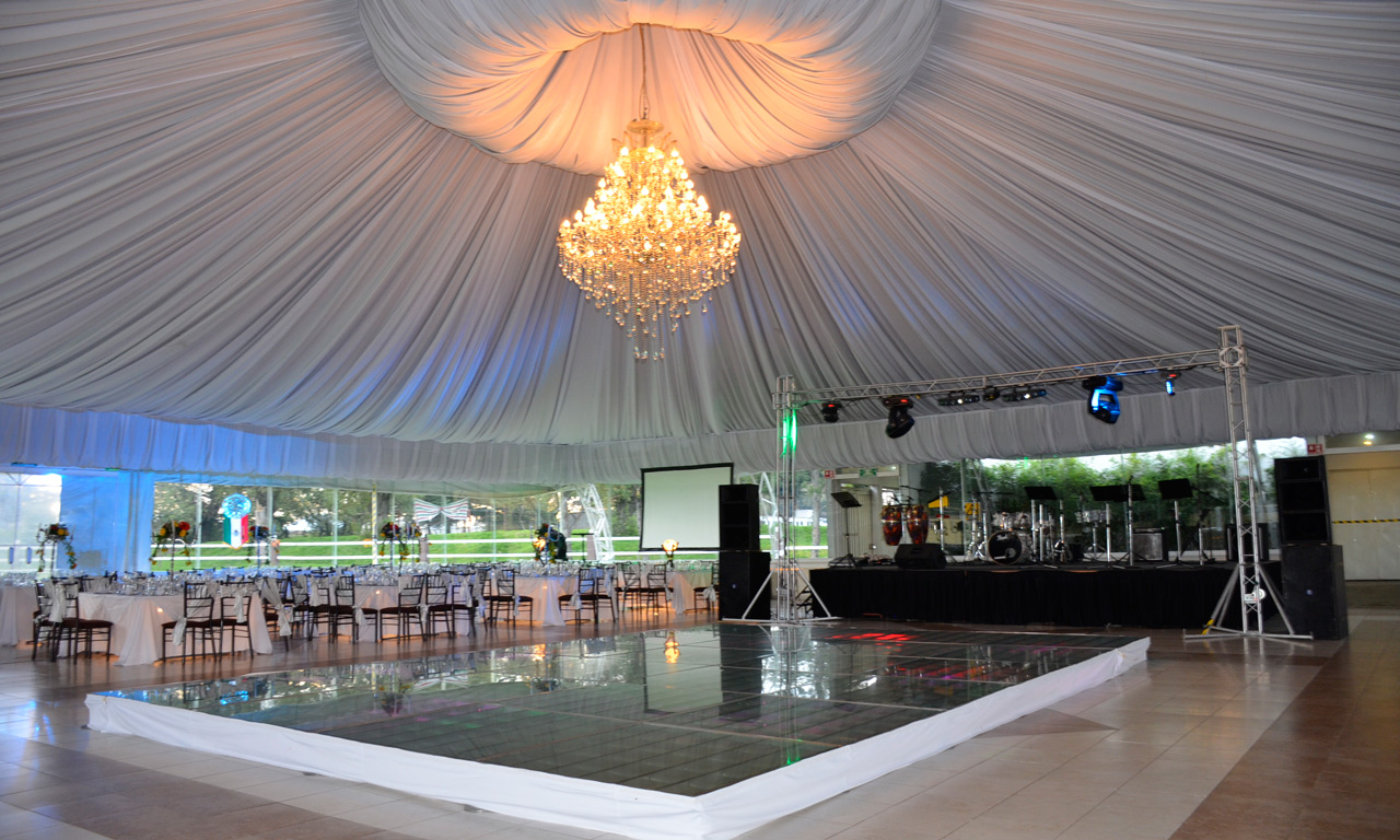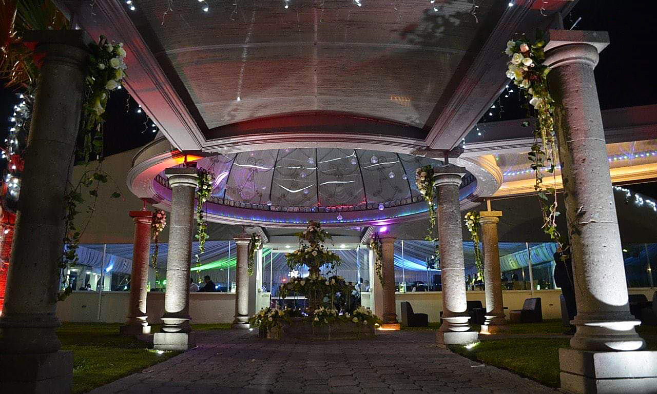 Salón “Jardín”, espectacular carpa con cristales para poder disfrutar de la vista de nuestros maravillosos jardines y de nuestro hermoso lago, rodeado de antorchas. Donde se destacan las telas en el plafón, y su espectacular candil, donde la luz arquitectónica le da una belleza, muy peculiar. La capacidad es desde 100 personas hasta 2000 personas.