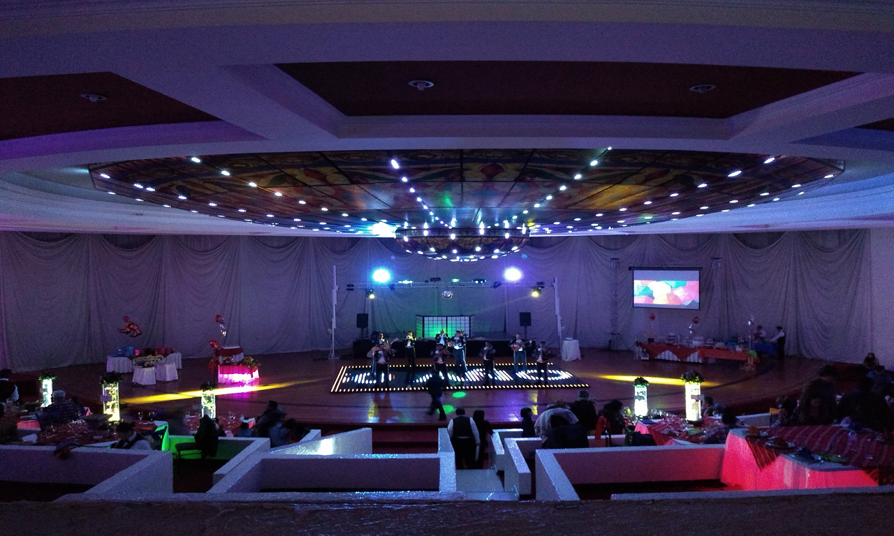 Salón “Casino” con una capacidad de 100 hasta 500 personas con un estilo único, es un salón en desniveles “tipo teatro”, con una tecnología de punta (pista inteligente, iluminación arquitectónica, iluminación robótica, galaxia en el plafón, iluminación computarizada en mesas y un elegante vitral).
